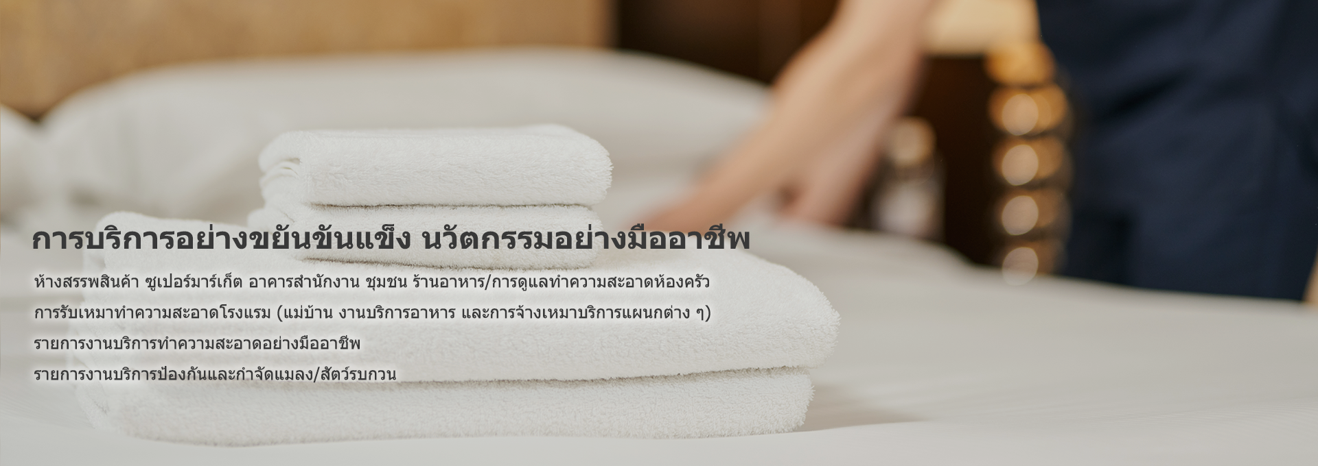 ปัจจุบันบริษัทของเรามุ่งเน้นให้บริการด้านสุขอนามัยและการทำความสะอาดเป็นธุรกิจหลัก โดยเน้นให้บริการกับโรงแรมระดับดาวทั่วประเทศ รวมถึงโรงแรมธุรกิจ โดยบริการของเราครอบคลุมถึงการทำความสะอาดห้องพักโรงแรม การดูแลรักษาความสะอาดในพื้นที่ส่วนกลาง การล้างและบำรุงรักษาเครื่องใช้บนโต๊ะอาหาร และการทำความสะอาดและดูแลห้องครัวในรูปแบบการให้บริการแรงงานประจำที่หน้างาน